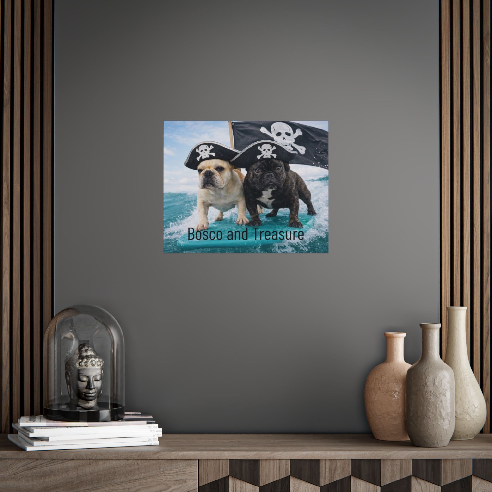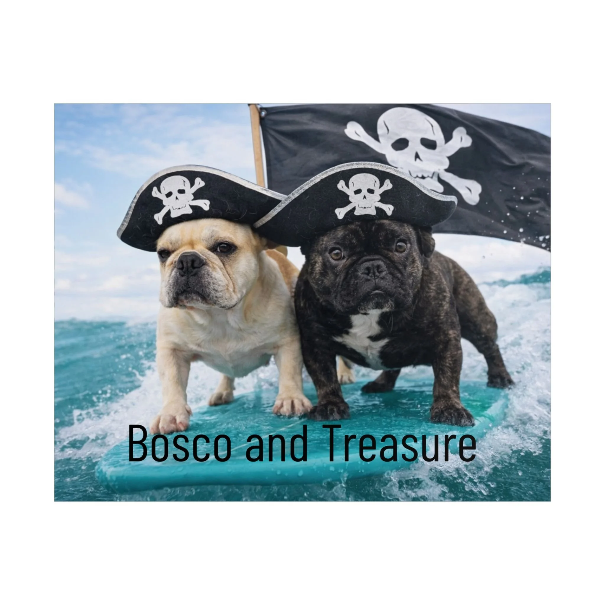 Two spirited French bulldogs stand firm on a rolling sea, wearing tiny pirate hats beneath a billowing Jolly Roger. This unframed poster brings playful adventure and cheeky charm to any room — a bright, high-definition print that feels like a snapshot from an impossible seaside romp. It hangs easily in a living room, hallway, or child's nautical nook and adds a splash of color and humor to everyday moments. The image invites smiles and sparks conversations, whether tucked into a gallery wall or given a place of honor above a console table.